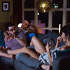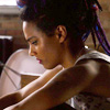 Description: Tuppence Middleton as Riley Gunnarsdottir in Sense8; reaching up to remove her headphones, frowning slightly